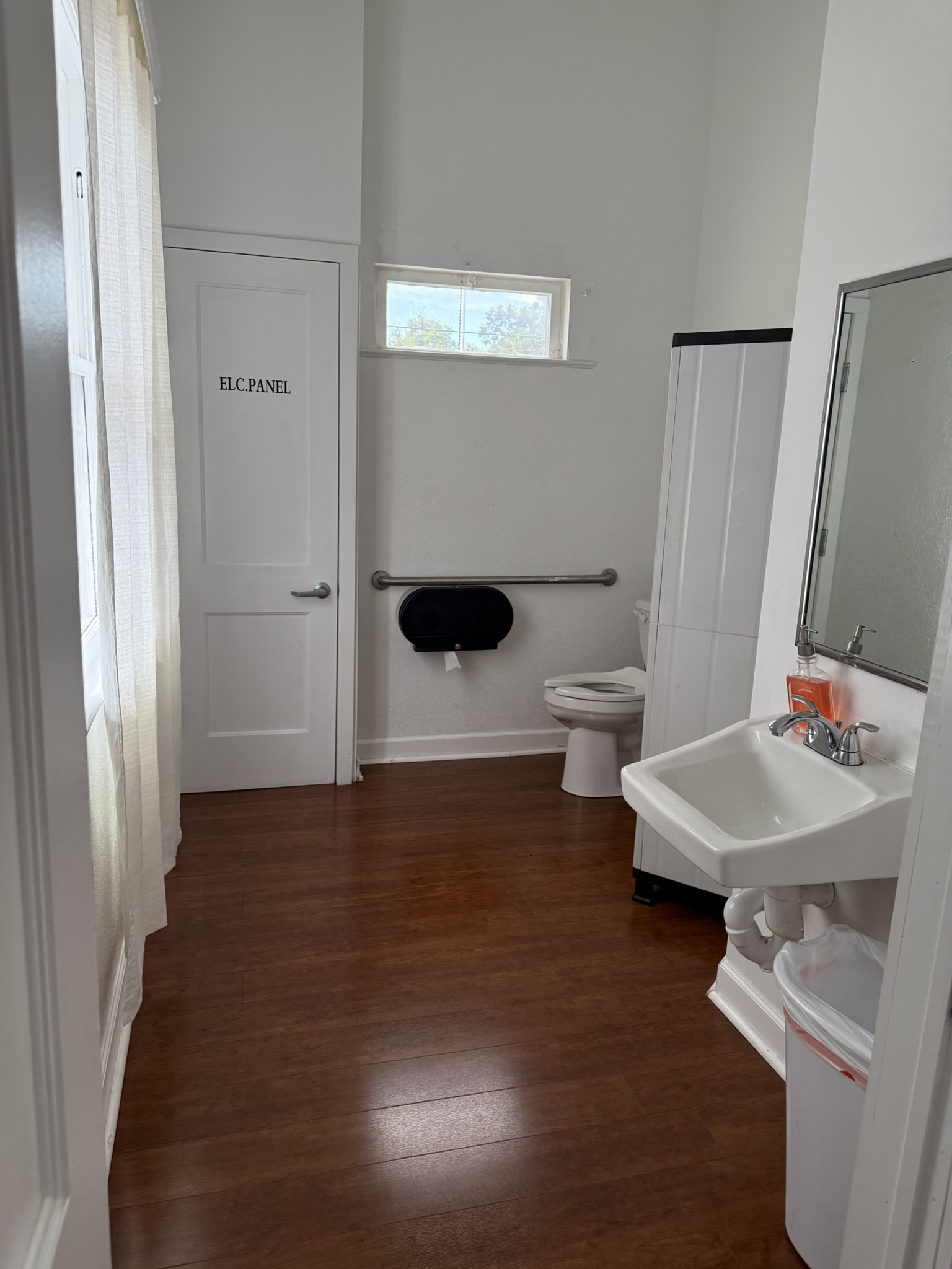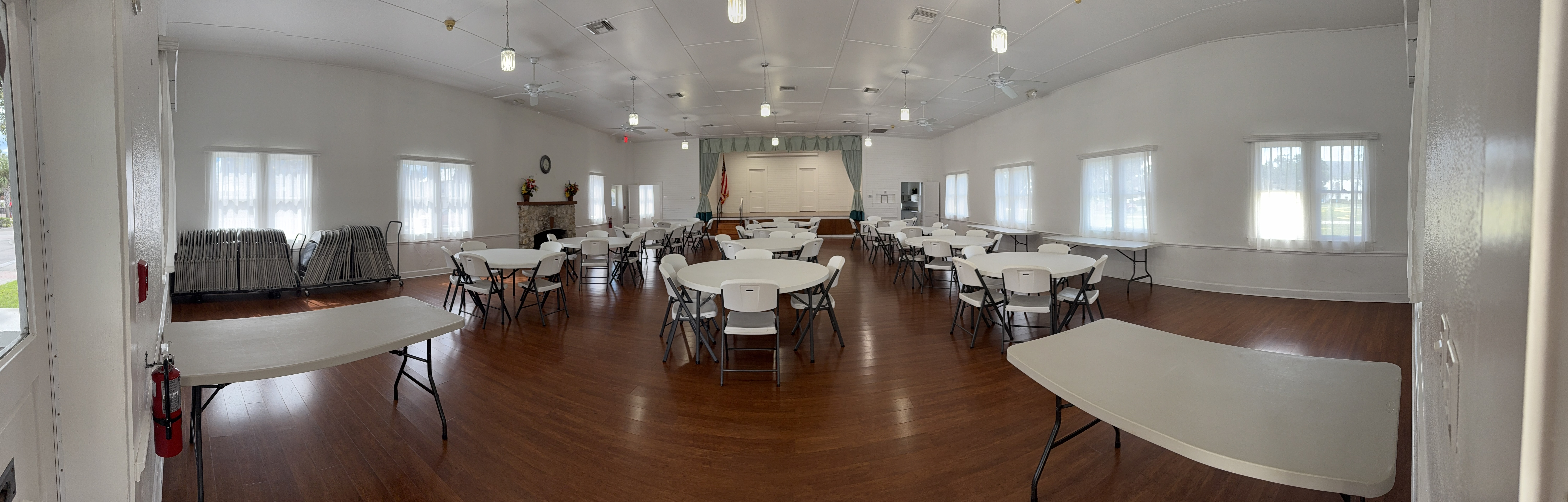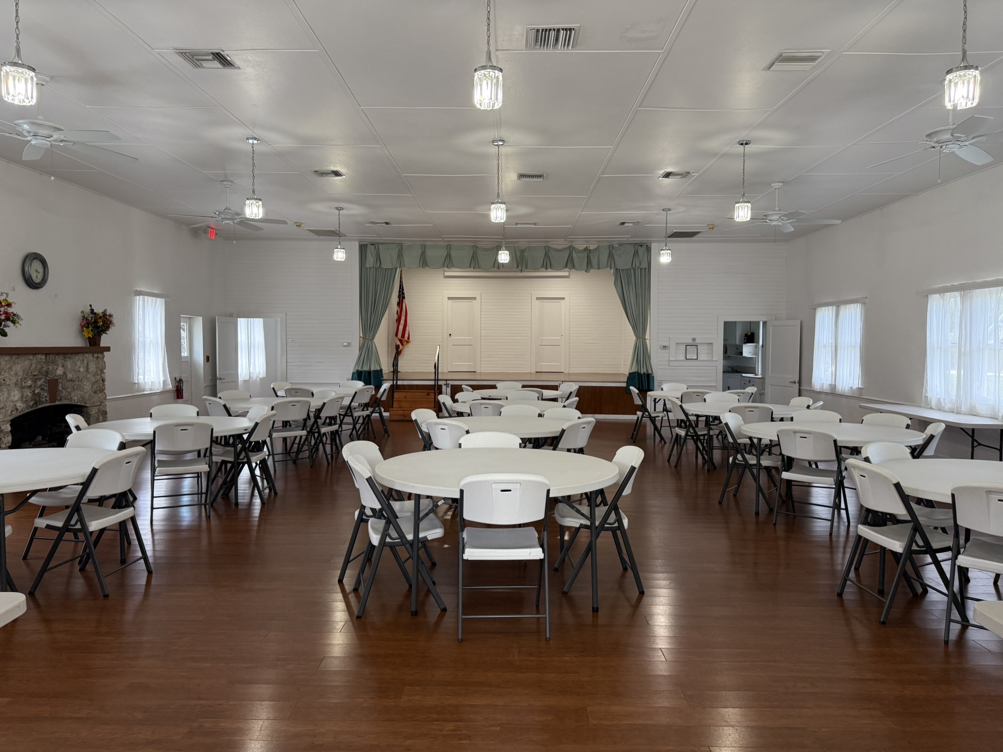 The main floor is 2,000 ft² plus a 400 ft² stage. The max capacity is 117 people. Rental includes the use 12 – 5′ (60″) round tables, 2 – 6′ rectangular tables, 2 – 8′ rectangular tables, and 115 chairs.